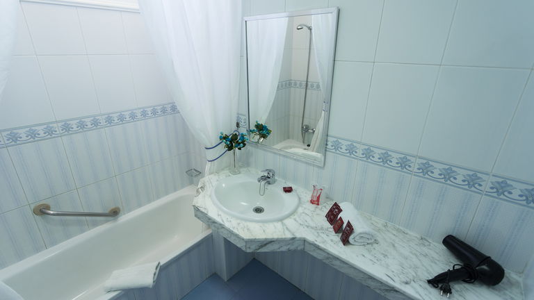 Algemene voorzieningen: Telefoon, balkon, badkamer met bad, satelliet-tv, kabel-tv, thee en koffie, haardroger, wekservice, strijkijzer, keuken, koelkast, magnetron, bureau, zithoek, kluisje tegen een extra vergoeding