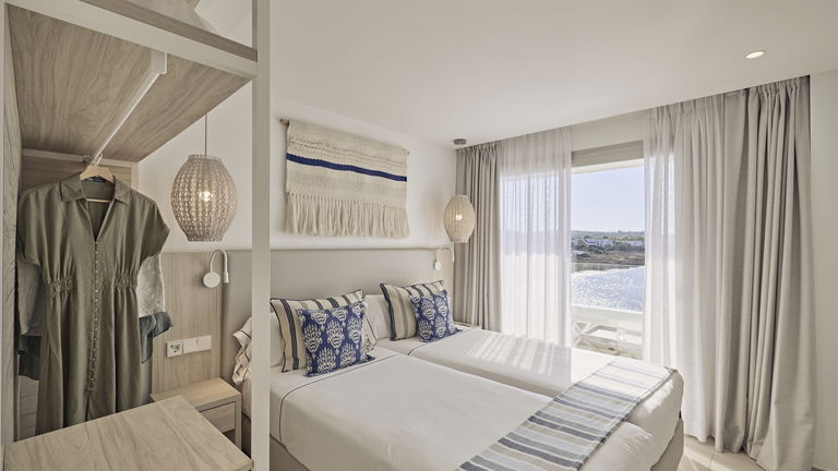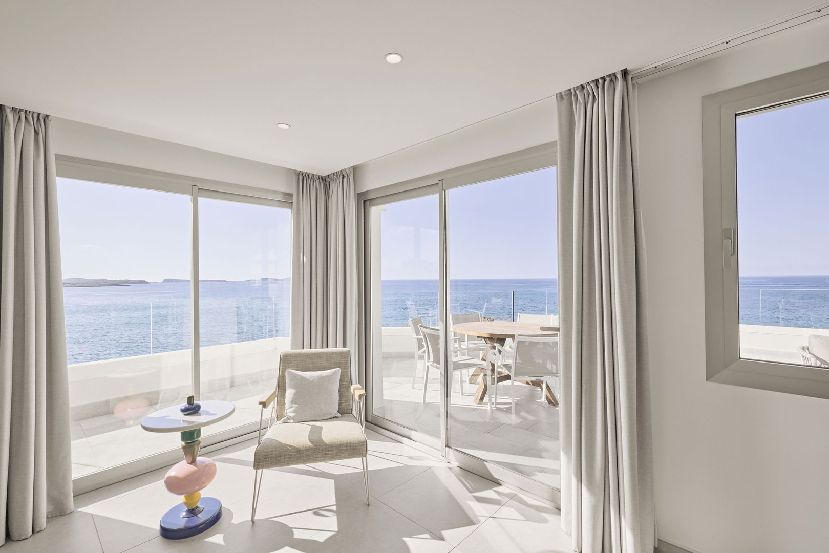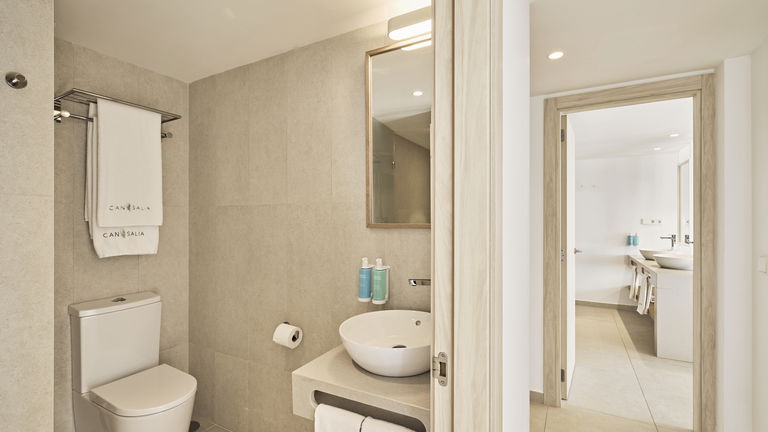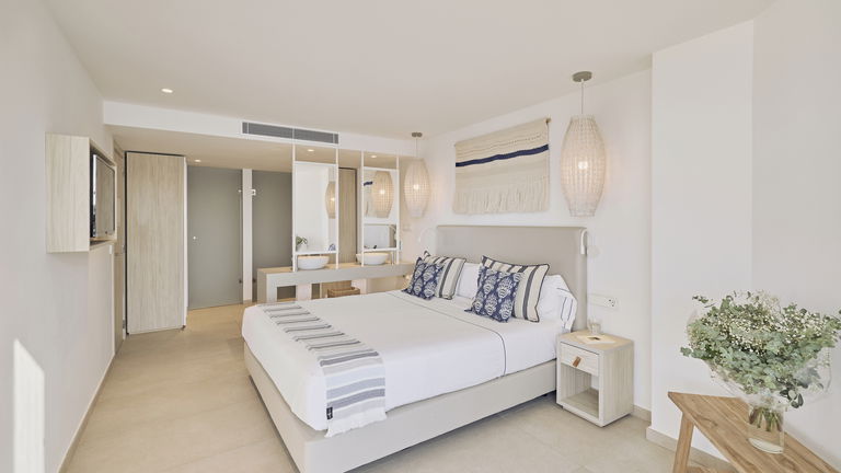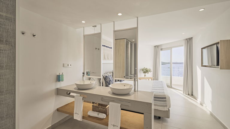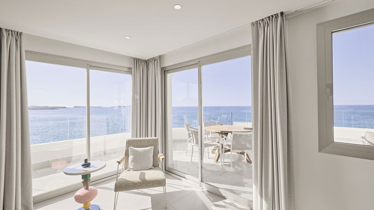 Dit appartement is het toppunt van luxe voor gasten die zichzelf willen verwennen met een droomvakantie op Ibiza. Vanaf deze ongelofelijke locatie, met prachtig uitzicht op de diepblauwe zee en enorm privéterras, zult u het gevoel hebben dat u de golven bijna kunt aanraken. De presidentiële suite met twee slaapkamers en panoramisch uitzicht op zee beschikt over twee grote tweepersoonskamers, allebei met een spectaculair uitzicht. De eerste heeft twee eenpersoonsbedden, terwijl de andere is uitgerust met een kingsize bed en een eigen badkamer. Er is ook een tweede volledig uitgeruste badkamer. In de open keuken die uitkomt op het woongedeelte kunnen de gasten gezellig samen koken en samenzijn, terwijl ze herinneringen creëren in een stijlvolle en comfortabele omgeving. Deze luxe appartementen hebben de ruimste terrassen van het hele complex, waardoor ze perfect zijn om quality time door te brengen met het gezin of een romantische avond met uw partner. Vanwege hun ligging aan de voorzijde van het gebouw zult u genieten van een adembenemend uitzicht op zee en de zonsondergang. Een ware must voor liefhebbers van de prachtige zonsondergangen van Ibiza.