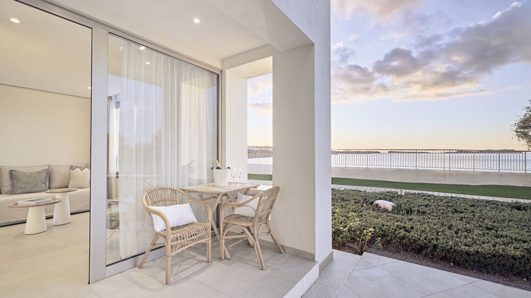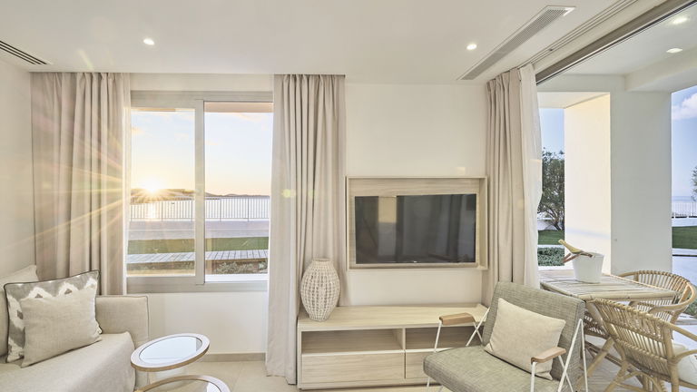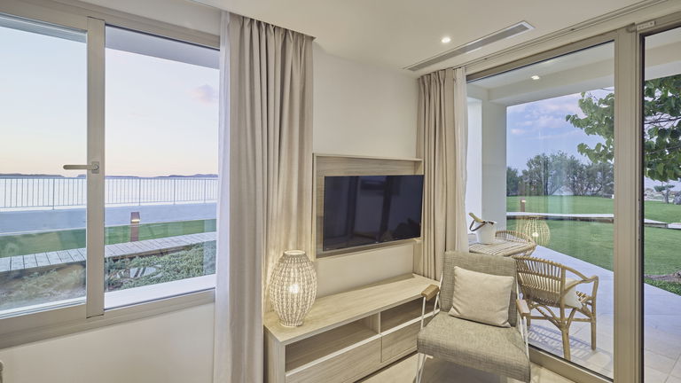 Suite bestaande uit een kamer met twee eenpersoonsbedden of een kingsize bed en een eigen badkamer. Het heeft ook een volledig uitgeruste aparte keuken. In de woonkamer vindt u een comfortabele bank en een satelliettelevisie in een open ruimte om familie- en/of vriendeninteractie te bevorderen. Vanaf het terras van het appartement heeft u een frontaal uitzicht op de zee, evenals directe toegang tot de tuin met een groot gazon.